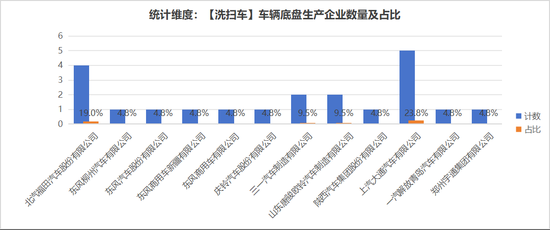 本次公告中的21款洗掃車(chē)的底盤(pán)生產(chǎn)企業(yè)共有12家,北汽福田汽車(chē)股份有限公司(4輛,占比19.0%)、東風(fēng)柳州汽車(chē)有限公司(1輛,占比4.8%)、東風(fēng)汽車(chē)股份有限公司(1輛,占比4.8%)、東風(fēng)商用車(chē)新疆有限公司(1輛,占比4.8%)、東風(fēng)商用車(chē)有限公司(1輛,占比4.8%)、慶鈴汽車(chē)股份有限公司(1輛,占比4.8%)、三一汽車(chē)制造有限公司(2輛,占比9.5%)、山東唐駿歐鈴汽車(chē)制造有限公司(2輛,占比9.5%)、陜西汽車(chē)集團(tuán)股份有限公司(1輛,占比4.8%)、上汽大通汽車(chē)有限公司(5輛,占比23.8%)、一汽解放青島汽車(chē)有限公司(1輛,占比4.8%)、鄭州宇通集團(tuán)有限公司(1輛,占比4.8%)。本次公告中的21款洗掃車(chē)中,均采用二類(lèi)底盤(pán)。