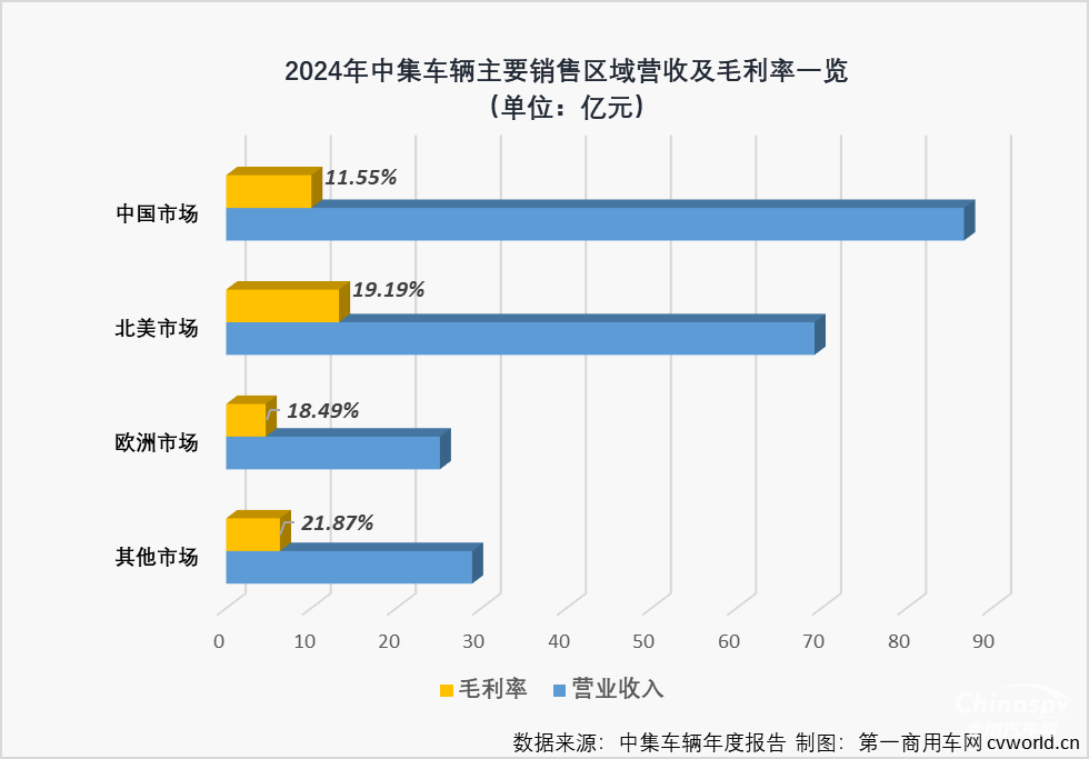 值得一提的是,2024年,中集車(chē)輛在各大銷(xiāo)售區(qū)域的毛利率繼續(xù)保持較高水平,其中中國(guó)市場(chǎng)、歐洲市場(chǎng)以及其他市場(chǎng)毛利率較上年均有所提升,分別提升了0.66個(gè)百分點(diǎn)、1.26個(gè)百分點(diǎn)和5.59個(gè)百分點(diǎn),即便是出現(xiàn)下滑的北美市場(chǎng),2024年毛利率也達(dá)到19.19%的較高水平(如下圖)。