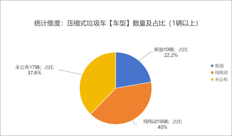 本次公告中的45款垃圾車中,柴油(10輛,占比22.2%)、純電動(dòng)(18輛,占比40%)、未公布相關(guān)數(shù)據(jù)(17輛,占比37.8%)。
