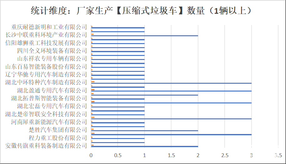未公布數(shù)據(jù)的垃圾車企業(yè)以及數(shù)量如下:湖北盈通專用汽車有限公司(3輛)、楚勝汽車集團(tuán)有限公司(1輛)、中氫寰宇新能源河北有限公司(1輛)、湖北博利特種汽車裝備股份有限公司(1輛)、安徽傳旗重科裝備制造有限公司(1輛)、湖北恒晟達(dá)汽車有限公司(1輛)、重慶耐德新明和工業(yè)有限公司(1輛)、湖北中環(huán)特種汽車制造有限公司(1輛)、程力專用汽車股份有限公司(1輛)、湖北永強(qiáng)專用汽車有限公司(1輛)、湖北新盛環(huán)衛(wèi)科技有限公司(1輛)、湖北宏磊專用汽車有限公司(1輛)、湖北瑞力汽車有限公司(1輛)、廣州市環(huán)境衛(wèi)生機(jī)械設(shè)備廠有限公司(1輛)、湖北博利特種汽車裝備股份有限公司(1輛)。