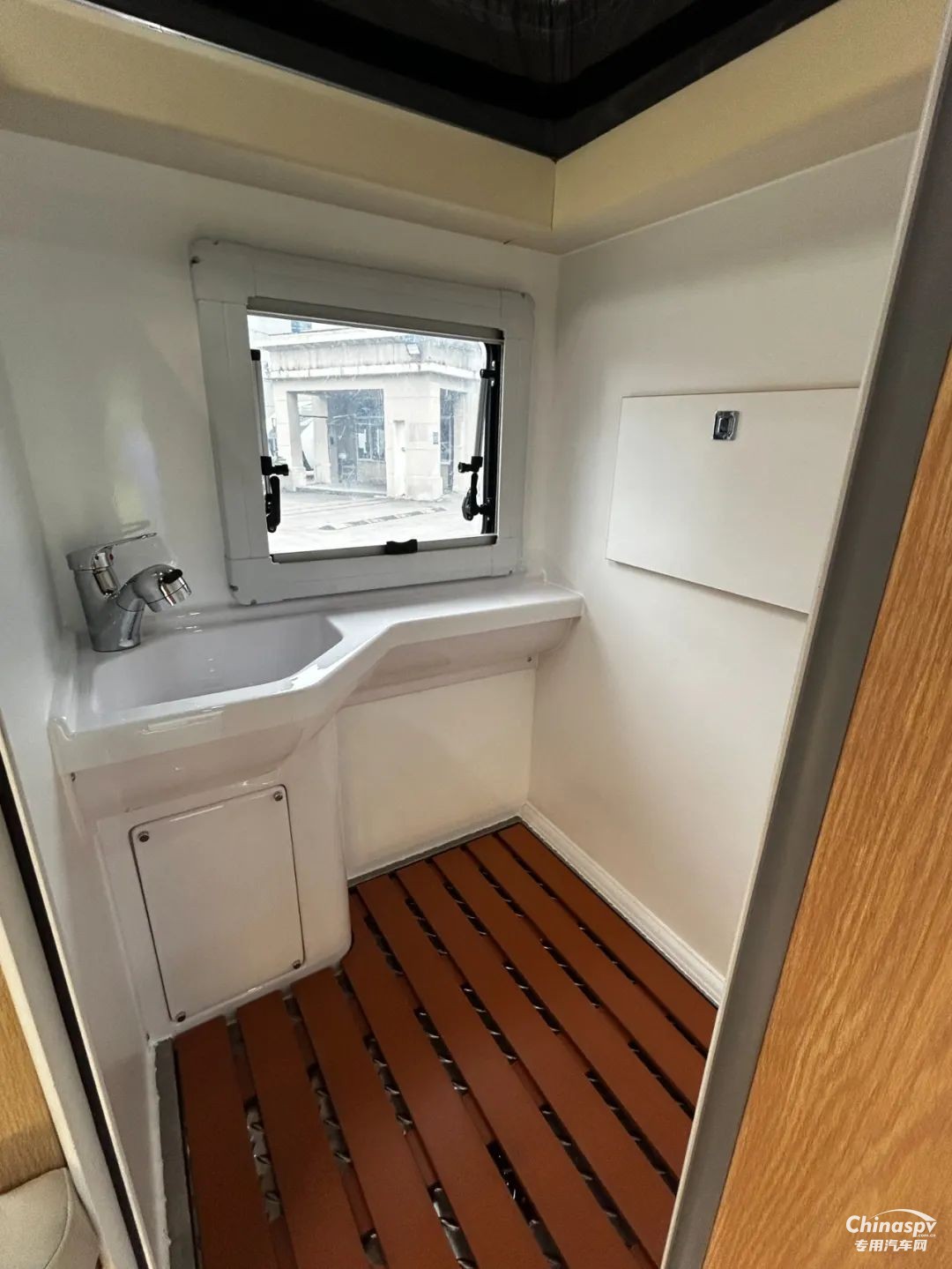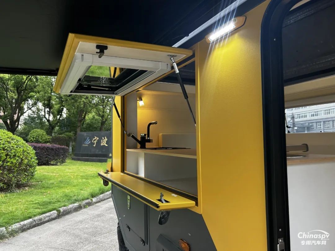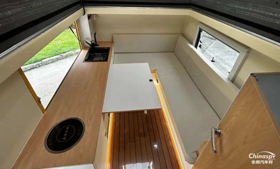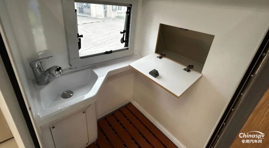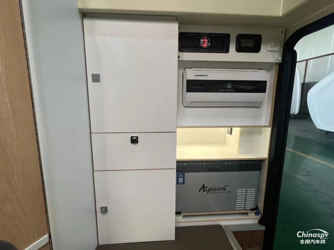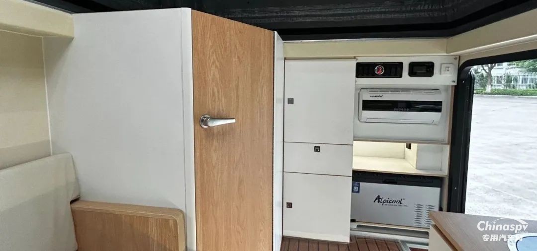 前部功能區(qū)配有空調(diào)、冰箱、集成控制面板、水位顯示器和電動升頂控制開關。衛(wèi)生間還貼心設置一暗格,以便洗漱用品存取。