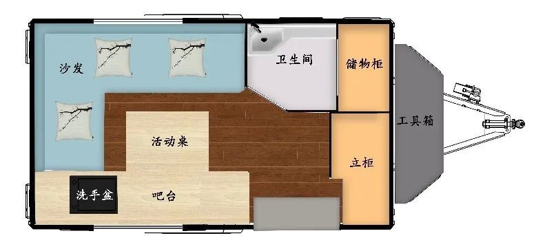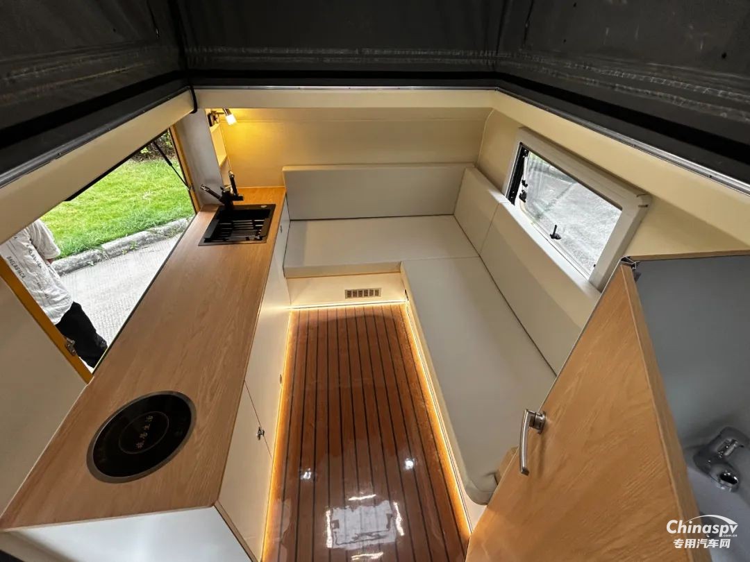 叁:內(nèi)部布局入戶門采用歐式房車專用門,主門與紗門可分離;入口右手邊是含便攜式冰箱、12V房車專用空調(diào)及整車電源控制集成開關等的立柜。旁邊是儲物柜及衛(wèi)生間,儲物柜可以放置一些休息時所使用的被褥枕頭及換洗衣物等,衛(wèi)生間配備洗手池淋浴花灑、便攜式馬桶。