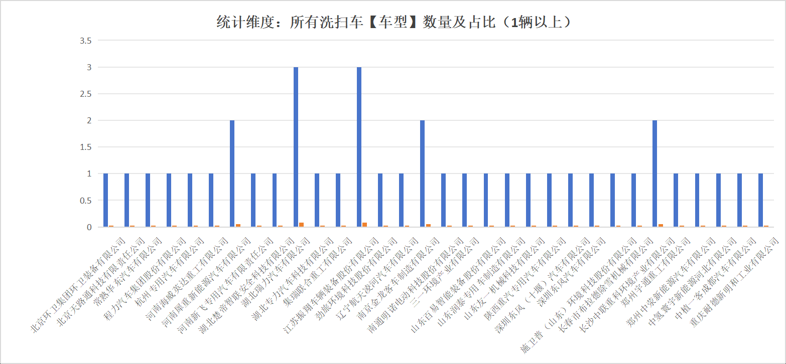 本次公告中的39款洗掃車的生產(chǎn)企業(yè)共有32家,河南海威英達重工有限公司(1輛)、河南犀重新能源汽車有限公司(2輛)、河南新飛專用汽車有限責任公司(1輛)、湖北楚帝智聯(lián)安全科技有限公司(1輛)、湖北瑞力汽車有限公司(3輛)、湖北專力汽車科技有限公司(1輛)、集瑞聯(lián)合重工有限公司(1輛)、江蘇振翔車輛裝備股份有限公司(3輛)、勁旅環(huán)境科技股份有限公司(1輛)、遼寧航天凌河汽車有限公司(1輛)、南京金龍客車制造有限公司(2輛)、南通明諾電動科技股份有限公司(1輛)、三一環(huán)境產(chǎn)業(yè)有限公司(1輛)、山東百易智能裝備股份有限公司(1輛)、山東潤泰專用車制造有限公司(1輛)、山東友一機械科技有限公司(1輛)、陜西重汽專用汽車有限公司(1輛)、深圳東風(十堰)汽車有限公司(1輛)、深圳東風汽車有限公司(1輛)、施衛(wèi)普(山東)環(huán)境科技股份有限公司(1輛)、長春市布拉德除雪機械有限公司(1輛)、長沙中聯(lián)重科環(huán)境產(chǎn)業(yè)有限公司(2輛)、鄭州宇通重工有限公司(1輛)、鄭州中滎新能源汽車有限公司(1輛)、中氫寰宇新能源河北有限公司(1輛)、中植一客成都汽車有限公司(1輛)、重慶耐德新明和工業(yè)有限公司(1輛)。