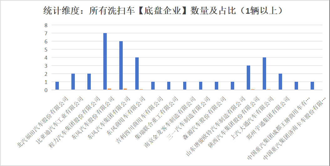 本次公告中的39款洗掃車的底盤生產(chǎn)企業(yè)共有17家,北汽福田汽車股份有限公司(1輛,占比2.6%)、比亞迪汽車工業(yè)有限公司(2輛,占比5.1%)、程力汽車集團股份有限公司(2輛,占比5.1%)、東風汽車股份有限公司(7輛,占比17.9%)東風汽車集團有限公司(6輛,占比15.4%)、東風商用車有限公司(4輛,占比10.3%)、吉利四川商用車有限公司(1輛,占比2.6%)、集瑞聯(lián)合重工有限公司(1輛,占比2.6%)、南京金龍客車制造有限公司(1輛,占比2.6%)、三一汽車制造有限公司(1輛,占比2.6%)、森源汽車股份有限公司(1輛,占比2.6%)、山東唐駿歐鈴汽車制造有限公司(1輛,占比2.6%)、陜西汽車集團股份有限公司(3輛,占比7.7%)、上汽大通汽車有限公司(4輛,占比10.3%)、鄭州宇通集團有限公司(2輛,占比5.1%)、中國重汽集團成都王牌商用車有限公司(1輛,占比2.6%)、中國重汽集團濟南卡車股份有限公司(1輛,占比2.6%)。本次公告中的39款洗掃車中,均采用二類底盤。