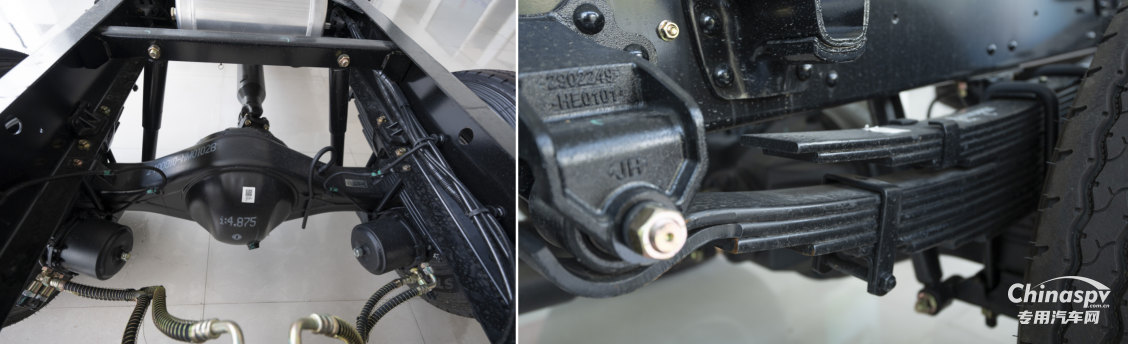 車(chē)架采用高強(qiáng)度鋼材,全鉚接結(jié)構(gòu),寬車(chē)架設(shè)計(jì),承載更堅(jiān)固。配合高強(qiáng)度多片簧懸架,7.00R16輪胎與加強(qiáng)鋼輪轂,前后鼓式制動(dòng)系統(tǒng),提升復(fù)雜路況下的穩(wěn)定性和安全性。后橋采用冷鏈專(zhuān)用4.33小速比后橋,支持4噸、6噸級(jí)后橋選擇,以滿(mǎn)足不同使用場(chǎng)景用戶(hù)的多樣化需求。
