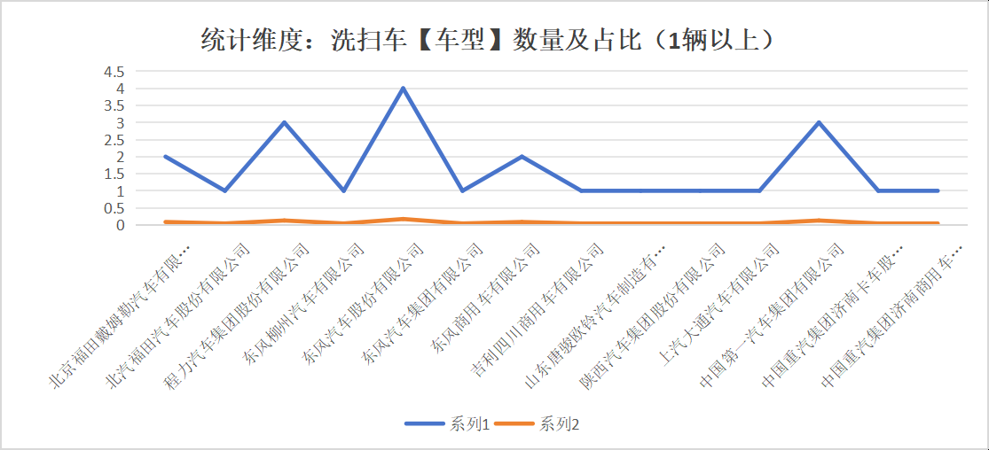 本次公告中的23款洗掃車的底盤生產(chǎn)企業(yè)共有14家,北京福田戴姆勒汽車有限公司(2輛,占比8.7%)、北汽福田汽車股份有限公司(1輛,占比4.3%)、程力汽車集團股份有限公司(3輛,占比13.0%)、東風柳州汽車有限公司(1輛,占比4.3%)、東風汽車股份有限公司(4輛,占比17.4%)、東風汽車集團有限公司(1輛,占比4.3%)、東風商用車有限公司(2輛,占比8.7%)、吉利四川商用車有限公司(1輛,占比4.3%)、山東唐駿歐鈴汽車制造有限公司(1輛,占比4.3%)、陜西汽車集團股份有限公司(1輛,占比4.3%)、上汽大通汽車有限公司(1輛,占比4.3%)、中國第一汽車集團有限公司(3輛,占比13.0%)、中國重汽集團濟南卡車股份有限公司(1輛,占比4.3%)、中國重汽集團濟南商用車有限公司(1輛,占比4.3%)。本次公告中的23款洗掃車中,均采用二類底盤。