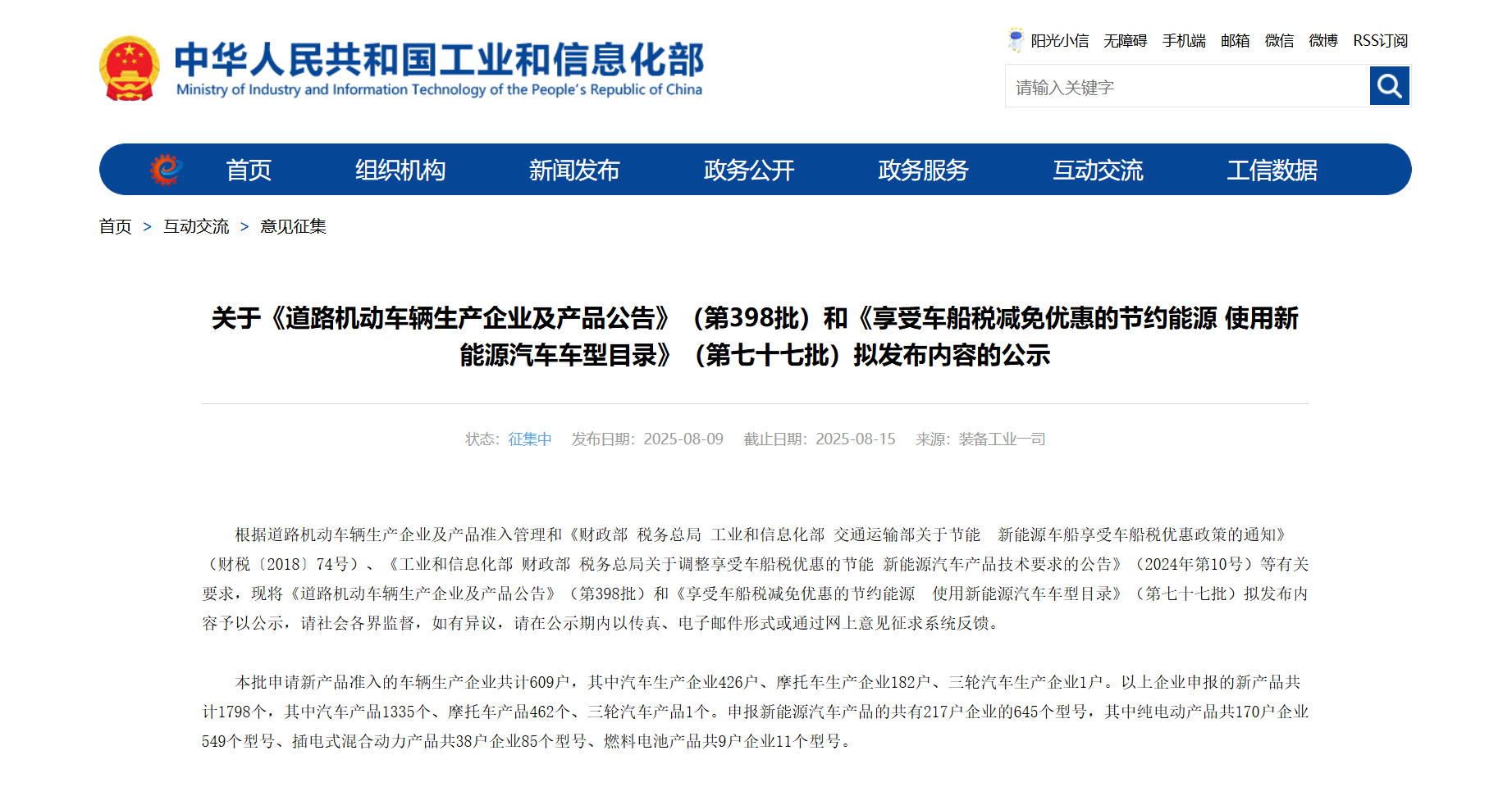 (財稅〔2018〕74號)、《工業(yè)和信息化部財政部稅務總局關于調(diào)整享受車船稅優(yōu)惠的節(jié)能新能源汽車產(chǎn)品技術要求的公告》(2024年第10號)等有關 要求,現(xiàn)將《道路機動車輛生產(chǎn)企業(yè)及產(chǎn)品公告》(第398批)和《享受車船稅減免優(yōu)惠的節(jié)約能源 使用新能源汽車車型目錄》(第七十七批)擬發(fā)布內(nèi) 容予以公示,請社會各界監(jiān)督,如有異議,請在公示期內(nèi)以傳真、電子郵件形式或通過網(wǎng)上意見征求系統(tǒng)反饋。