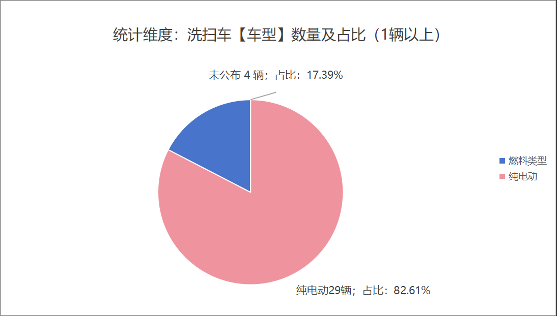 本次公告中的23款洗掃車中,采用純電動能源(19輛,占比82.61%)、未公布能源情況(4輛,占比17.39%)。