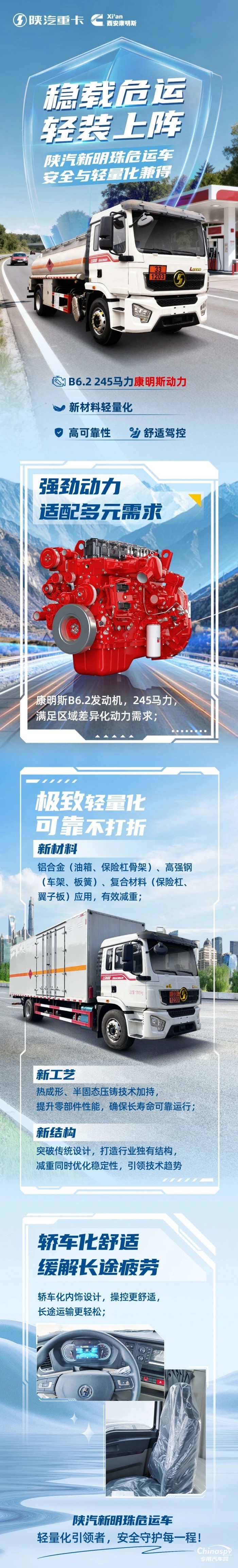 陜汽新明珠危運車+245馬力康明斯B6.2發(fā)動機,輕量可靠不打折,安全舒適享輕松!