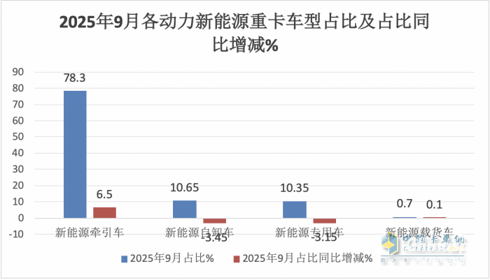 上圖表可見,在2025年9月各類新能源重卡各個(gè)細(xì)分車型銷量同比、占比及占比同比增減中: