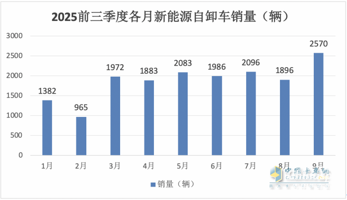 上圖可見,2025年9月新能源自卸車銷售2570輛,居2025年前三季度各月銷量第一。根據(jù)既往終端上牌數(shù)據(jù),追溯到2025年之前各月的新能源自卸車銷量,發(fā)現(xiàn)從未有超過2000輛銷量的月份,因此完全可以斷定,2025年9月的新能源自卸車銷量也創(chuàng)下史上月度最高。