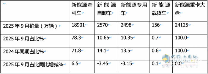 表2,根據(jù)終端上牌數(shù)據(jù),2025年9月新能源重卡各細(xì)分市場銷量、占比及占比同比增減: