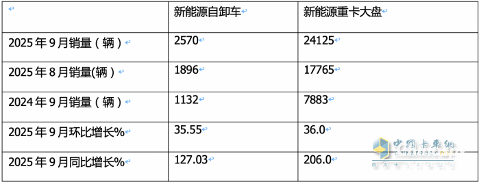 表1,根據(jù)終端上牌數(shù)據(jù),2025年9月新能源自卸車銷量同環(huán)比及與新能源重卡大盤比較: