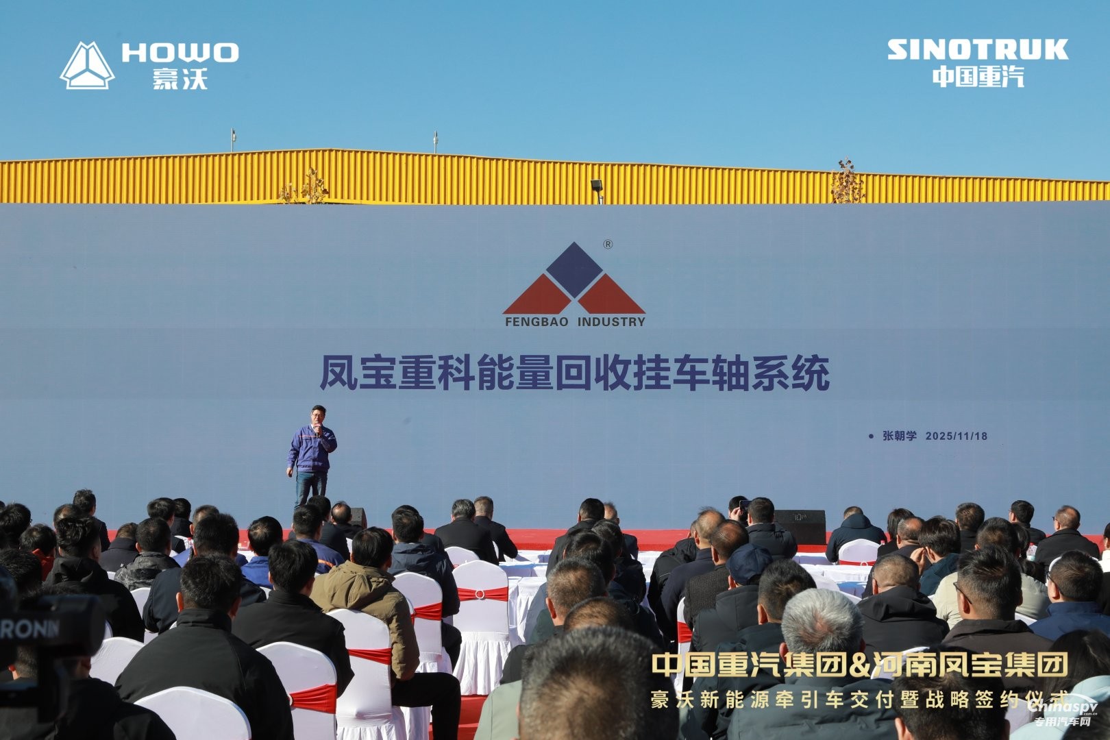 2025 年 11 月 18日紅旗渠畔的鳳寶重科廠區(qū)內(nèi),中國重汽與河南鳳寶集團(tuán)舉行戰(zhàn)略合作簽約儀式,同時鳳寶重科的“新能源掛車發(fā)電軸動力系統(tǒng)”產(chǎn)品也在簽約儀式上首次發(fā)布。此次合作聚焦新能源商用車產(chǎn)業(yè)應(yīng)用,雙方將聯(lián)手打造區(qū)域領(lǐng)先的綠色運(yùn)輸裝備生態(tài),標(biāo)志著兩大企業(yè)在 “雙碳” 目標(biāo)指引下的深度協(xié)同正式啟動。