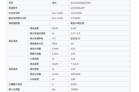 ZLJ5162GQXLZE4型清洗車適用于城市道路、廣場、機場、港口碼頭、公路等的清洗作業(yè)和噴霧降塵的多功能清洗車。具有獨立的高、低壓兩套水路系統(tǒng),工作裝置采用模塊化設計,可選配多種清洗作業(yè)功能和輔助作業(yè)功能,噴水架能清洗路面陳舊污漬,角噴可以沖洗路緣、護欄隔離帶等;護欄清洗刷可以清洗城市道路及公路護欄;液壓升降平臺可清洗及維護道路空中設施;高壓噴槍可清洗路標、廣告牌等;噴霧系統(tǒng)具有強大的噴霧降塵及調節(jié)空氣濕度功能。