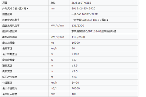 ZLJ5160TXSJE3型洗掃車采用解放定型汽車二類底盤,加裝東風康明斯副發(fā)動機、風機、垃圾箱、清掃裝置、低壓降塵系統(tǒng)、吸嘴、高壓水泵、低壓水泵、清水箱、高壓清洗系統(tǒng)、液壓系統(tǒng)、氣動系統(tǒng)、電控系統(tǒng)等部件改裝而成。主要配套件實行全球采購,性能優(yōu)良、工作可靠。