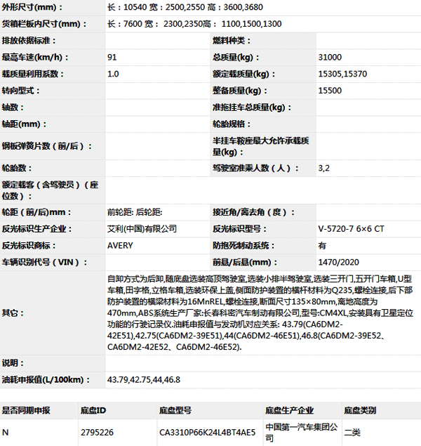 公告型號 CA5310ZLJP66K24L4T4AE5