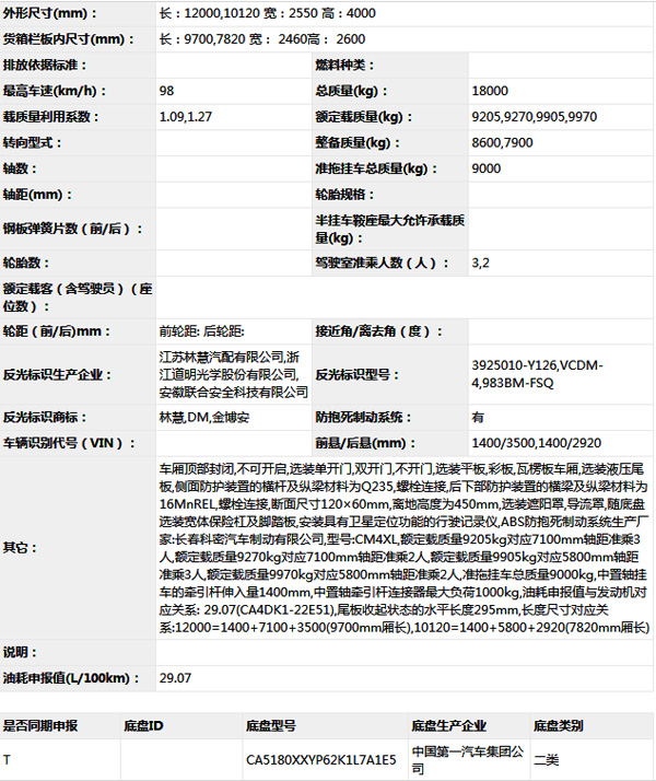 公告型號(hào) CA5180XXYP62K1L7A1E5