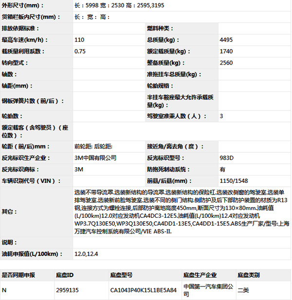 公告型號 CA5043ZKXP40K15L1E5A84